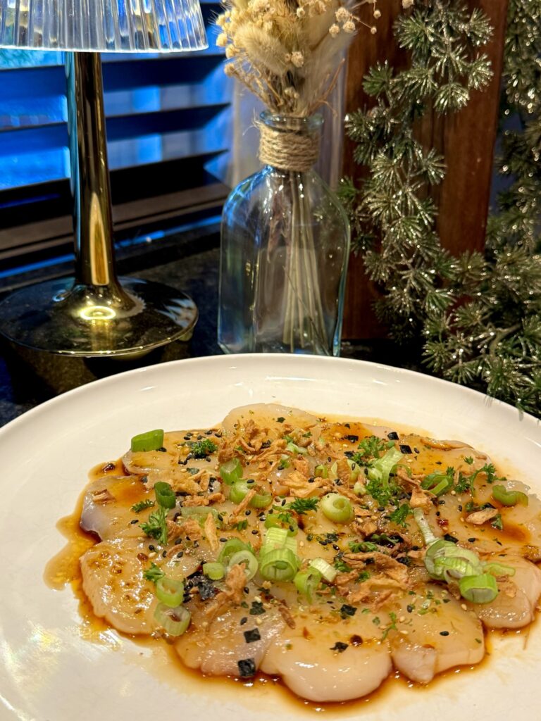- Strooi wat furikake kruiden over de coquilles en garneer de borden met sesamzaadjes, fijngesneden bosui en gebakken uitje.